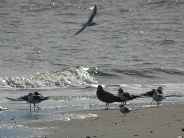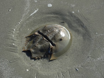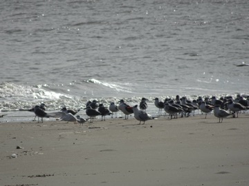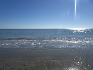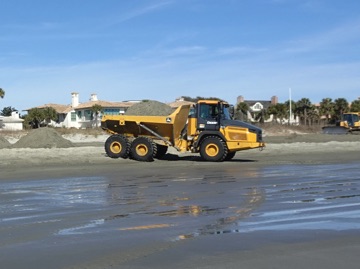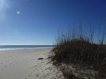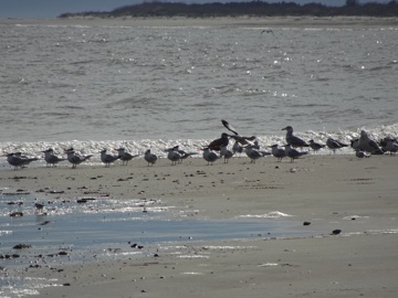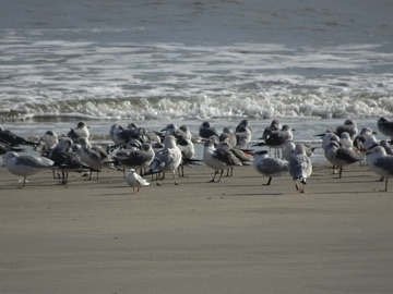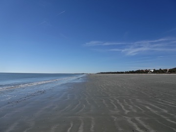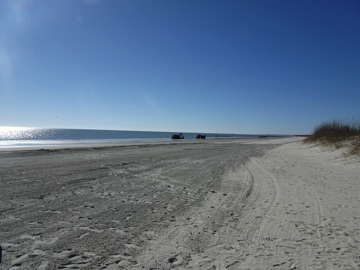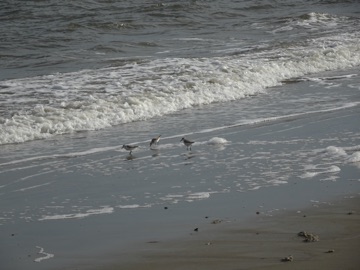 We took a walk along the beach looking for birds and sea life. There were some sand dollars, some peeps and some pelicans flying. There were also a few machines moving around sand at low tide.