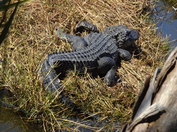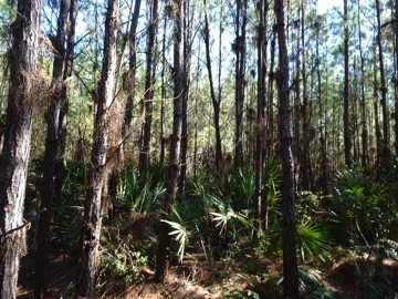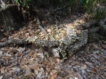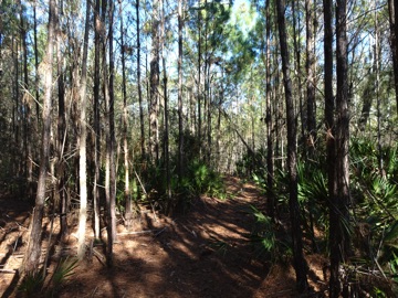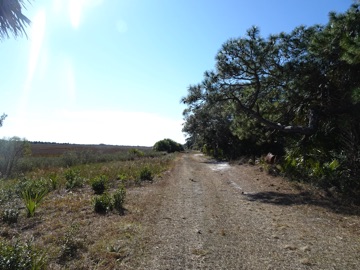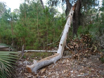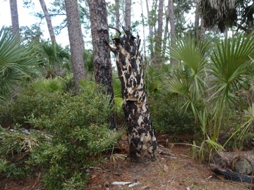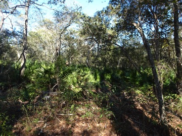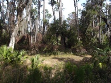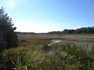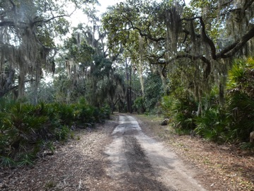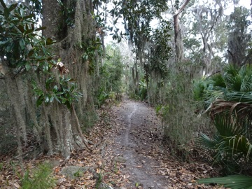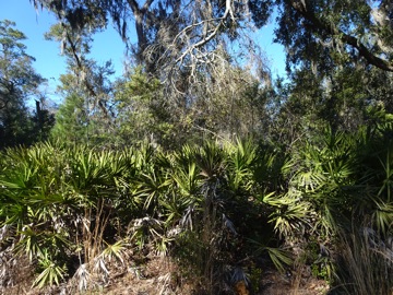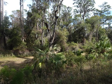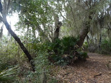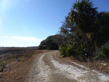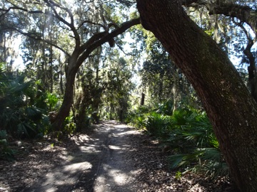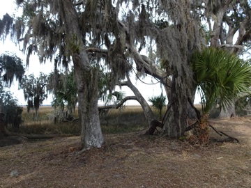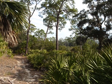 One of our favorite places to wander on Big St. Simons Island is the Guale Preserve. Coming from the Northwest, it's exotic country with its flat terrain, gnarled trees, sandy soil and palmettos. The first part of our walk had a bit of up and down though not enough to qualify as terrain. It was old sand dunes now covered with organic matter, forest and palmetto. We headed back on the old telephone line trail which was completely flat. Welcome to the Southeast.
