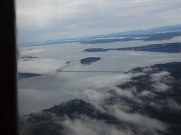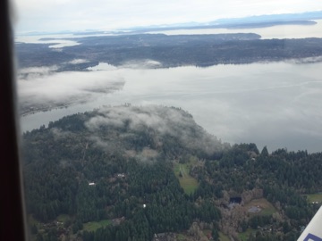 We left Boeing Field and flew west. Below, the problem was obvious. There was a lot of fog down there, and it was clinging to land. The sky was clear enough over water, but we had hopes of landing without having to swim to shore.