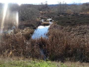 It was almost spring like at the Dungeness Dike. It was a bright sunny day, and we had started at the schoolhouse rather than near the creamery. There was an eagle on display and bright shiny water. We were sure it was still winter, but we saw some Queen Anne's lace in bloom, a wooly bear caterpillar out crossing the trail and, to our great surprise, the first skunk cabbage of the year. It has been a mild winter, so maybe this isn't as odd as we think.