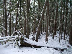There was no snow in the parking lot, but about 600' apl (that's above parking lot) we started seeing a thin crusting along the trail. The traction was great, so we kept on going. The wooden bridge over the stream was covered with perhaps a quarter inch of snow, but even we managed to cross it. It wasn't until about 1200' apl that the trail started to seem snowy. From here on up we could definitely feel that we were walking on snow, and as we ascended, the snow got deeper. We turned around about 1600' apl, and as you can see in the picture, there was an inch or two of snow.