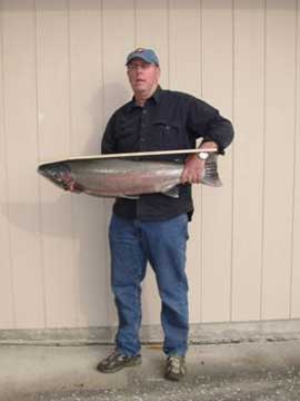 That's our friend, Bill Peet, on the left, with a friend of his, a three foot long steelhead he caught out on the Soleduc River. There hasn't been much fishing lately, what with the spring floods and fishing restrictions, so that's a pretty amazing catch for the first day the river was fishable. The Soleduc is pretty amazing, too. It's the only steelhead run in the lower 48, and it is in pretty good shape as you can see.