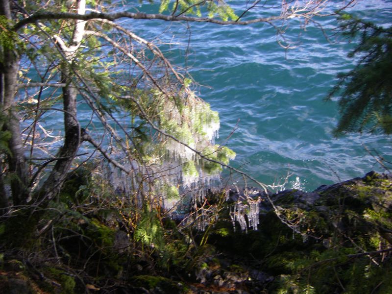 The icicles along the Spruce Railroad Trail are back. We last noticed them back in March. They are as beautiful as ever, especially with the lake's blue waters behind them.