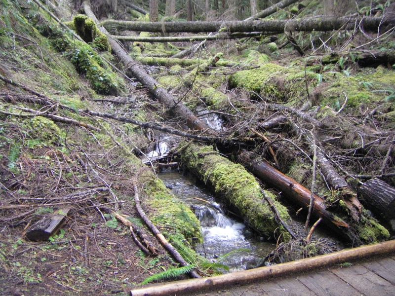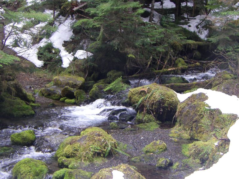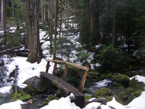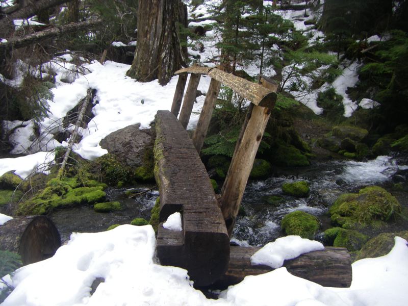 The snow on the Lake Angeles Trail seems to come and go, but lately it has been going. We haven't nerved ourselves to cross the little bridge yet, but we've made a few trips that far already, and surely, we'll cross that bridge on our very next trip, or the one after that.