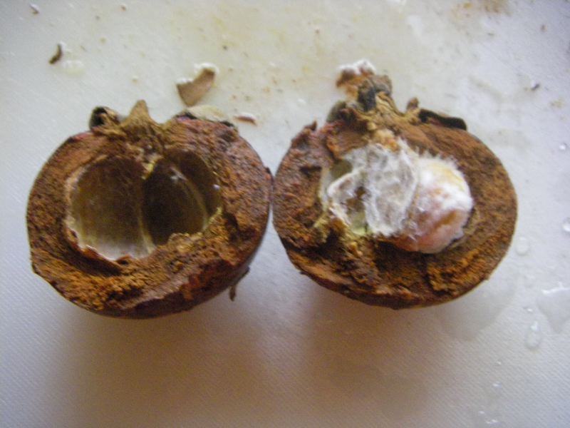 They were selling mangosteens at the local Albertson's. One always hears about mangosteens in books and newspaper articles, but, unlike mangoes which are on sale everywhere, mangosteens are harder to find. Curious, we bought a few. They were hard and husky. Our first thought was that they had dried out and wouldn't be edible. We set to work. It took a bit of doing to crack them open, but we were in luck. The fruit was still moist, and it was delicious. It's hard to describe the flavor. It was nothing like a mango. It was more of a citrus flavor, but not exactly. They are definitely delicious, so we'll be keeping our eyes open if another batch comes in.
