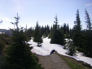 The snows are melting rapidly, and most of the trail is clear. The shaded section through the trees (from The Bench to The Hamper actually) still has a fair bit of snow, but it's well packed and the footing is obvious. The area near the Hurricane Hill Trail side spur is also still covered with snow, but melting rapidly. The side spur is already walkable, at least for a ways.