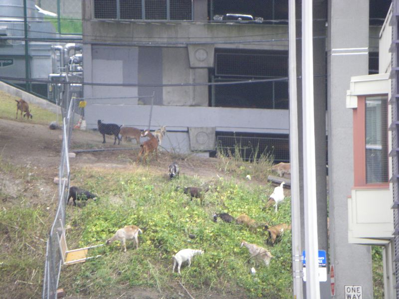 We were wandering around near Pike's Place Market when we saw these goats on the steep hillside. They're definitely urban goats and quite hungry. Apparently, they can't get a mower for that steep slope, so the goats are their answer. According to the press release, they're from Rent a Ruminant.