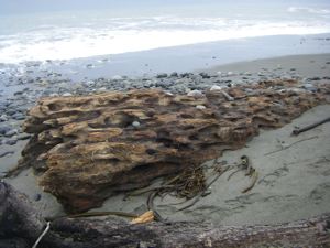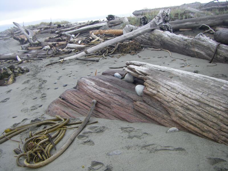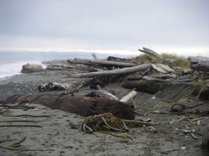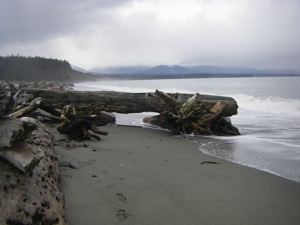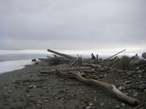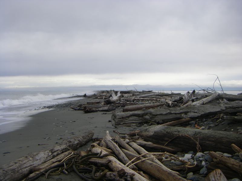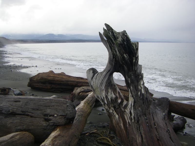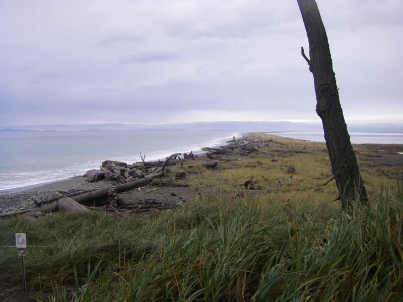 If you read our web site, you'll know that we prefer coastal hiking when the tides are low, ideally at three feet or less, but this time of year has terrible hiking tides, so we decided to tackle the Dungeness Spit a mere hour after an eight foot high tide. According to our tide calculator, the tides were still over seven feet when we set out, so there wasn't much beach, and what there was was often blocked by driftwood. We set out grimly, clambering along that part of the spit we usually view from the beach below.