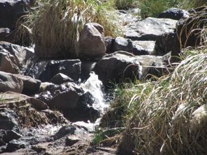 We made our way down the rocks to the canyon floor and walked, clambered and crawled upstream. Now and then we'd leap the stream or scramble over the rocks to bypass a waterfall. It was moist in the canyon, with tall cactus about along with a broad variety of plants, many in flower. There were also big clumps of pampas grass, many six or eight feet tall, and we'd sometimes have to fight our away upstream through thickets of them.