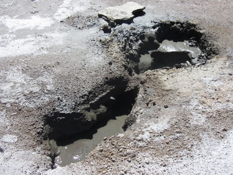 Most people go to see the Tatio Geysers at dawn. We had already seen an Andean dawn at our own private salar, so we went to see the geysers later in the morning. En route, we passed tour bus after tour bus, all heading back from their dawn excursions. By the time we arrived at the geysers, there was one other car, a Belgian family with one of those biycle campers soaking in a hot pool, and the caretakers.