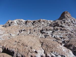 The Valley of the Moon has other surprises, including strange pillar like formations carved from small hills by the wind, heat, cold and rain. The loop road was closed by the recent rains. It was covered with salt, not snow, and under the salt, water was on the move.