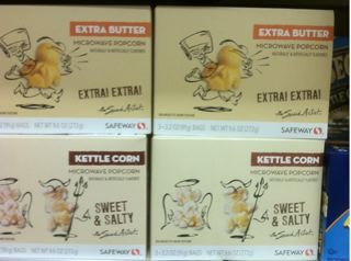 We aren't sure who designs these boxes of store brand products, but someone must be having fun. We've already posted on the various cereal clones, but now the house brands are taking over the popcorn shelf with horrible puns. You'll notice the packages are shaped just like the major brands, but the labels are quite distinctive.