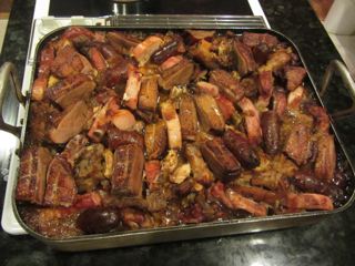 We held our cookie tree decorating party last weekend, and not only did we have more people hard at work decorating cookies than ever before, but we also had more people eating heartily than ever before. Luckily we had lots of saucisson en croute, grilled chicken kabobs on skewers, two bries en croute (with cranberry chutney) and a grilled skirt steak salad with red peppers, purple onion, and celery. There were also lots of gingerbread cookies, many of which were decorated and wound up on our cookie tree.