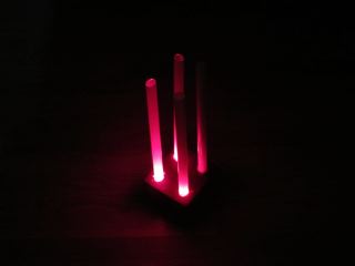 This was a last minute Christmas present suggested by most recent flight back from Seattle. The climb out of Boeing Field takes one over an industrial area south of Seattle. It doesn't look like much by day, but there are all sorts of fascinating lights by night. One set was hypnotizing, a set of four columns lighted two at a time, moving about an invisible shape. A quick trip to the Radio Shack provided an Arduino processor and some red LEDs. JoAnn's fabrics and hobby supplies next door provided four plastic columns for supporting elaborate wedding cakes. Add in a glue gun, a soldering iron and some black foam board, and there was something new under the tree. Be sure to click and watch the dark video. It can be hypnotic.