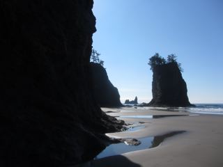 We were two hours before low tide, but it was a very low tide, so there was a lot of wet beach, gray and sparkling. The seastacks were as magical as ever. They almost seem impossible, or at least improbable, but there they are, remnants of an eroding shoreline, each with its own watershed and forested topping, an ecological island of fresh water surrounded by salt.