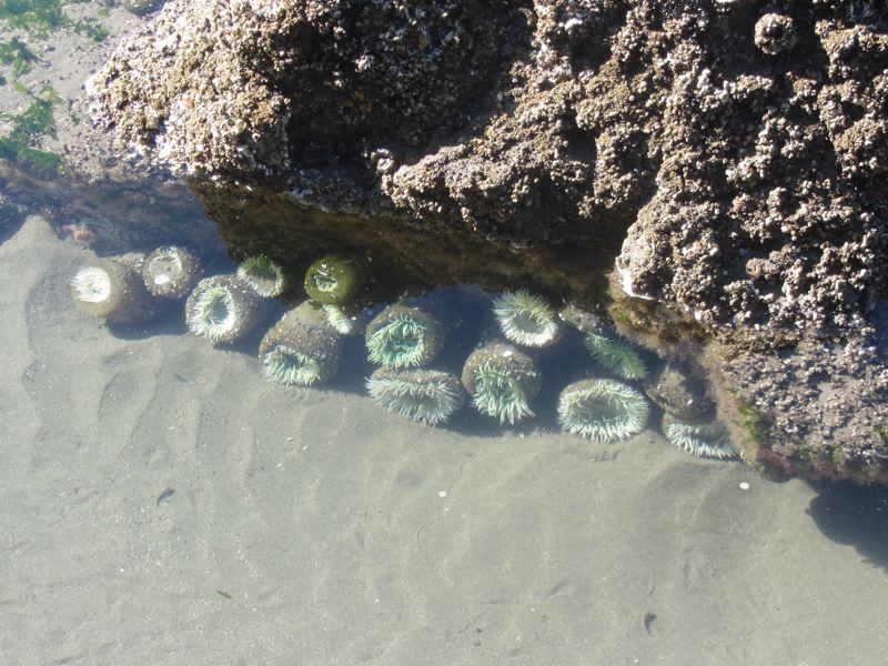 We made our way south, stopping to explore a few tidal pools and checking out the star fish and anemomes. The tide was far out and there was a lot of sand. We walked the still wet sand to the little sea cave and then made our way out towards the headland. In winter, this area is often rocky, but it was still summer here. We explored the coves and the rocks at the base of the far seastacks, then, well before low tide we started home.
