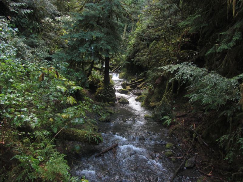 We were lazy today, so we took a short hike at Marymere Falls which flows into Barnes Creek not far from the south shore of Lake Crescent. Despite the government shutdown, the Barnes Creek parking lot was open, though the ranger station and bathrooms were closed. The rain forest and the river, however, were in full operation and, with today's peep of sunlight, quite beautiful.