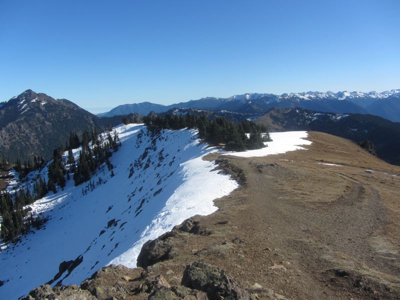 At some point it became apparent that we were likely to make it to the ridge. We had a clear view of Mount Olympus over Sunrise Point. It was exhiliarating. Then we made our last switchback and made our way to ridge proper, passing between the rocks. Before us was the sweeping view of the strait, of the islands, of Vancouver Island, of Mount Baker and, it seemed, everything. We approached the overlook, and the wind struck. It had been windy at Hurricane Ridge, imagine that, but our climb had been warm and sunny with the icicles glistening as they melted. Here, we were unsheltered, on a ridge, again. The wind blew hard and cold. It was a winter wind.