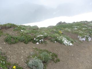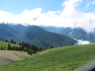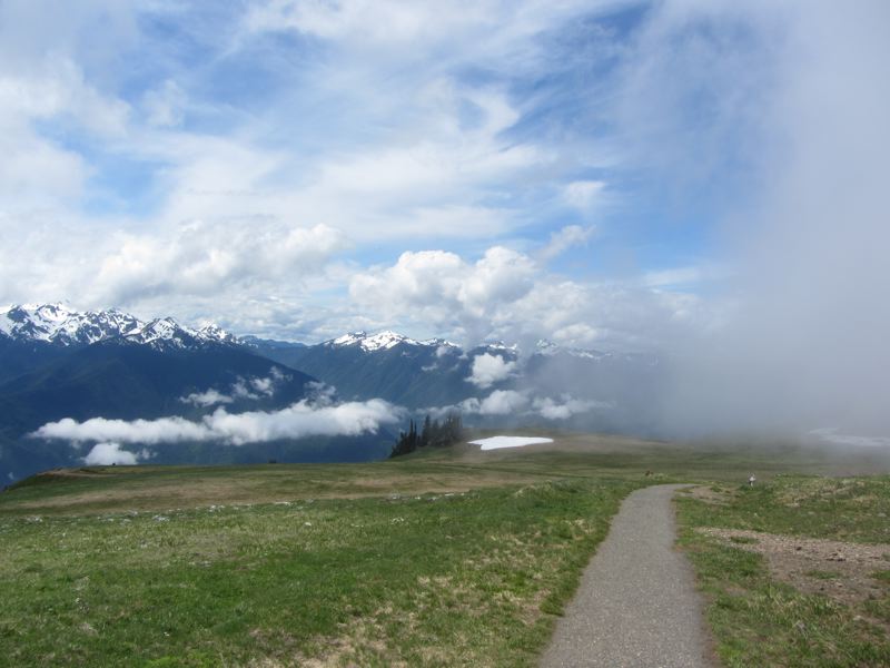 While we were exploring, clouds and mist were rising in the north, and by the time we were heading back, they had engulfed the top of Hurricane Hill. Through the mists we could see a blue lake forming from the melted snow and a golden marmot cooling him or herself on the snow.