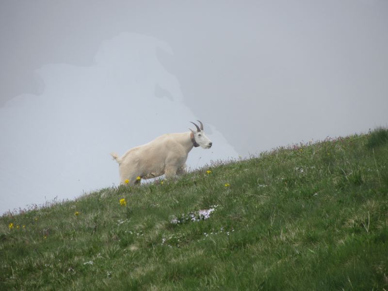 The flowers are near their peak on Hurricane Hill. The phlox may even be a touch past its peak, though its scent lingers. The lupines are blooming, as are the western wallflowers, glacier lilies, rock larkspur, avalanche lilies and yarrows. The marmots are out and active, as are the deer. There was also a mountain goat wandering about. The park service seems to have fitted this one with a collar. These can be dangerous animals, so we kept our distance.