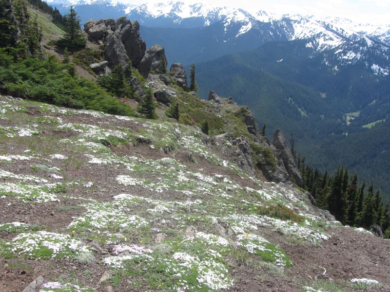 This is always an exhausting hike, but the sense of the mountain and the spectacular views always make it worth the effort. This time that effort included having to clamber over a few remaining mounds of snow. The trail starts among trees in the ghost forest, then emerges onto the lush hill side. Most of the flowers have yet to bloom, though there was plenty of richly scented phlox and a lot of golden glacier lilies.