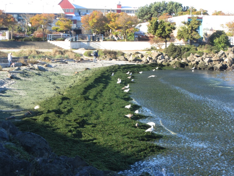 Hollywood Beach is the little beach in downtown Port Angeles near where Lincoln Street meets the strait, or would if the street ran down into the water. It's usually just a little spot of sand to explore, but this time it was covered with a band of green. What was it? Seaweed? There were some bits of it on the waterfront trail, but mainly along the beach.