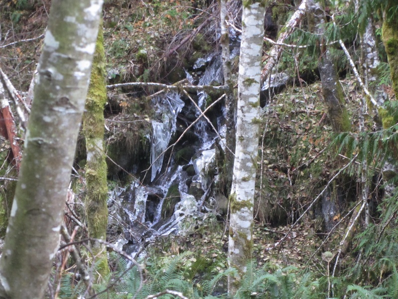 The trail to Olympic Hot Springs is open again after three long years. We had never taken the old trail, so this was a double first for us. Apparently, the road used to end quite close to the hot springs. Now, it's a 2.4 mile walk along a trail which was obviously the old roadbed. It was easy to tell. The trail is as wide as a road, and there were several bridges we crossed that were clearly designed for automobiles, not hikers. It was an easy 300 odd foot ascent from the trailhead to the hot springs, but here and there they cut drainage ditches right across the old roadbed. Some of them were a bit deep, and there was some ice on the trail, so we had to watch our step.