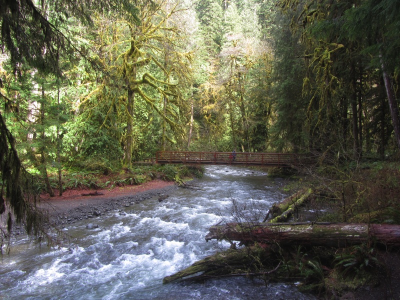 One of the great things about visiting Marymere Falls on a sunny day is the way that brilliant sunlight filters to the forest floor making it look like an exotic jeweled jungle. We almost expect to see an allosaurus or triceratops dashing through the ferns and foliage. The falls are pretty too.