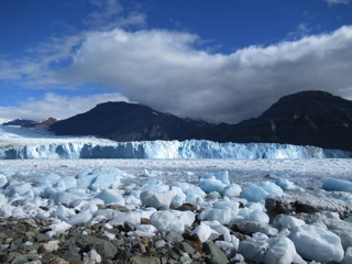 While we dined, the glacier entertained us as chunks of ice snapped and cracked and dropped into the sea leaving clouds of shattered ice in their wake. For a while, after a large piece of ice dropped, the sea where we were would stay calm, but after a while the sea would start to churn. The chunks of floating ice would rise and fall as the wave front moved past with an ominous rushing sound like an angry river.
