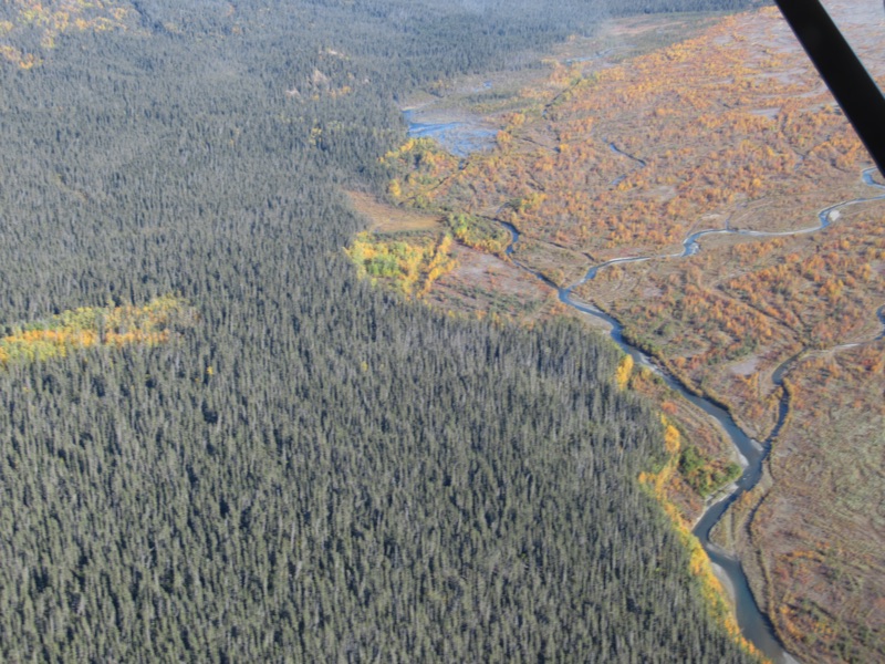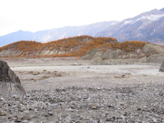 We hadn't expected autumn foliage in Alaska. I suppose we imagined that the trees would go from green to barren in one single powerful blast of cold air coming off the slopes of the Brooks Range if not from the Arctic. We seem to have arrived at its peak. The forest were golden in contrast to the pale blue color scheme of the distant mountains.