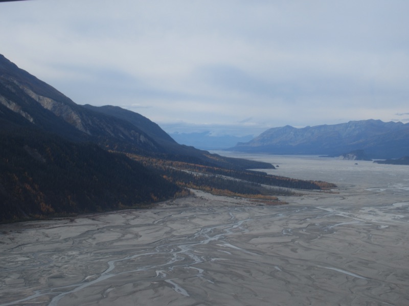 Then we flew downriver and landed to explore clear water pools, almost amazingly blue, and brown milky river channels. We were regretting that this was our last day by the Chitina.