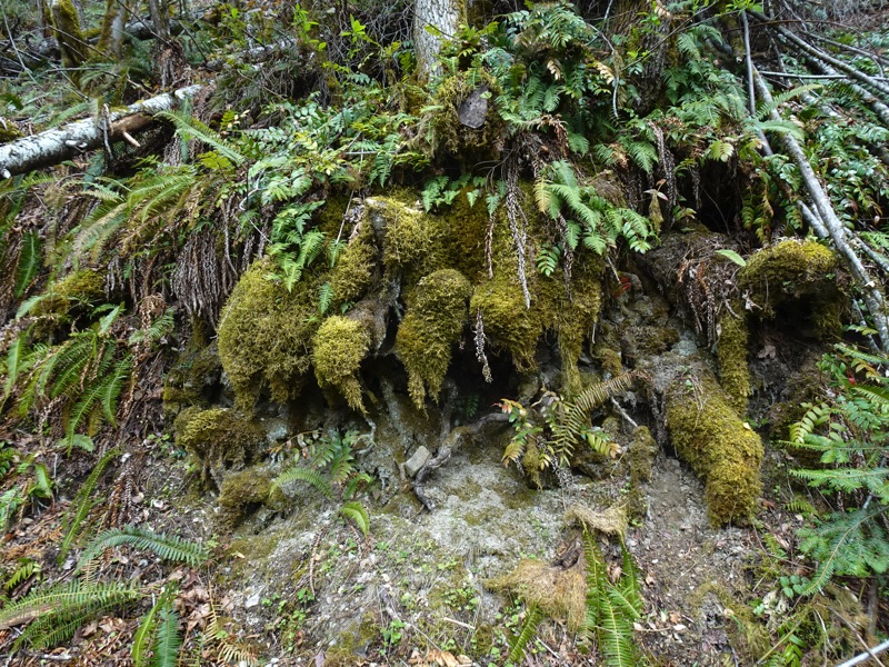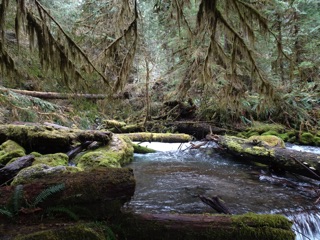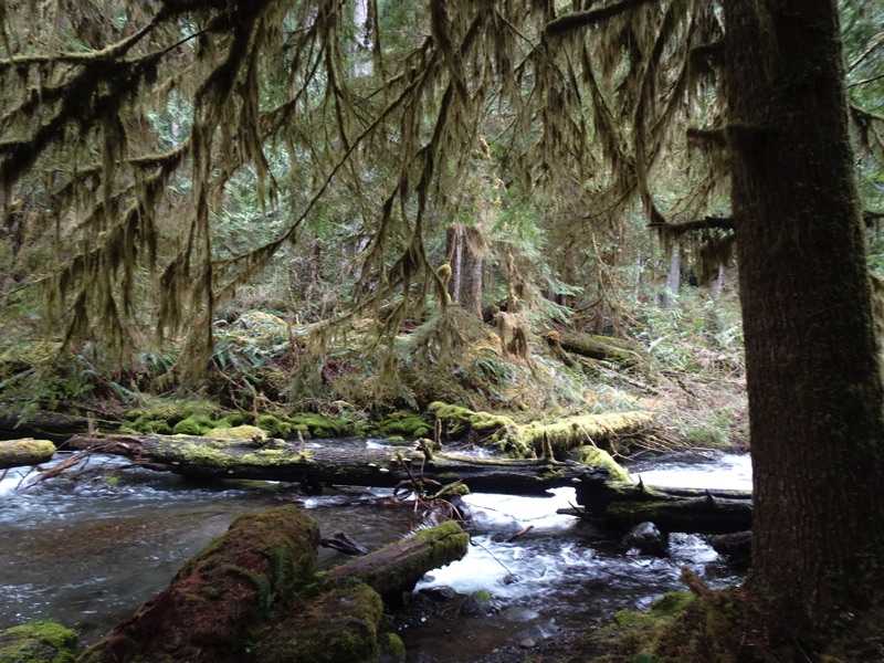 The detour trail heads up past a work area at the end of the service road and then heads higher to a junction with the Cascade Rock trail. There are glimpses of the Elwha along the way as it follows the ridge past the washout. After the junction the trail goes down a bit, then up a bit, then slowly descends behind the old campground. There is a sturdy tributary of the Elwha running between the trail and the collapsed campground pavilion.