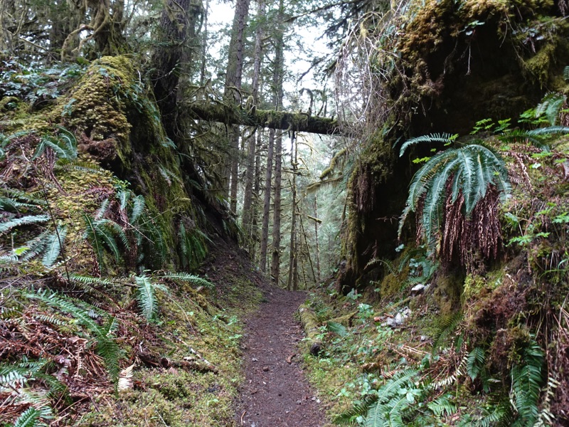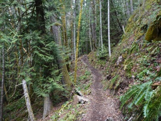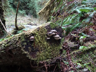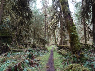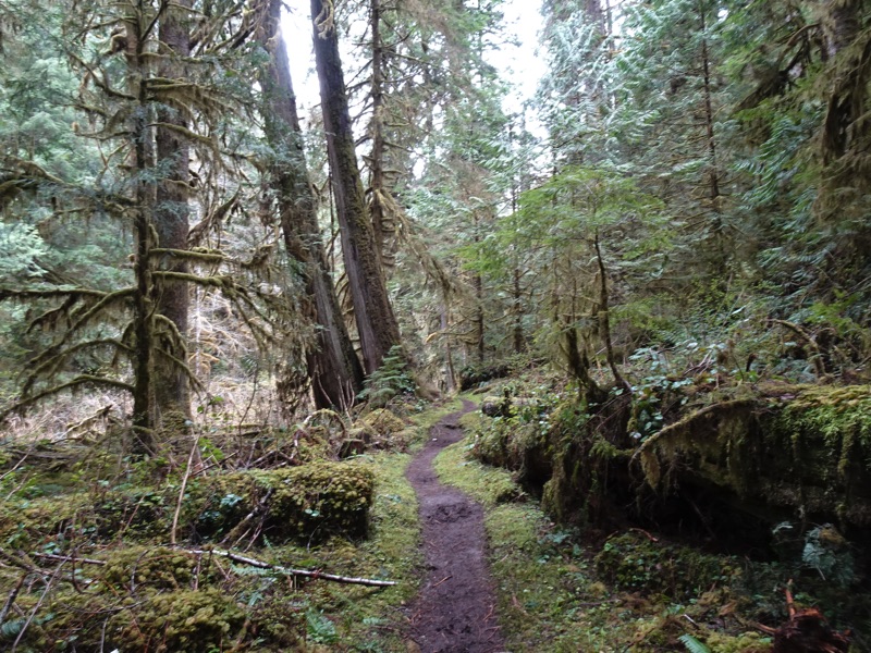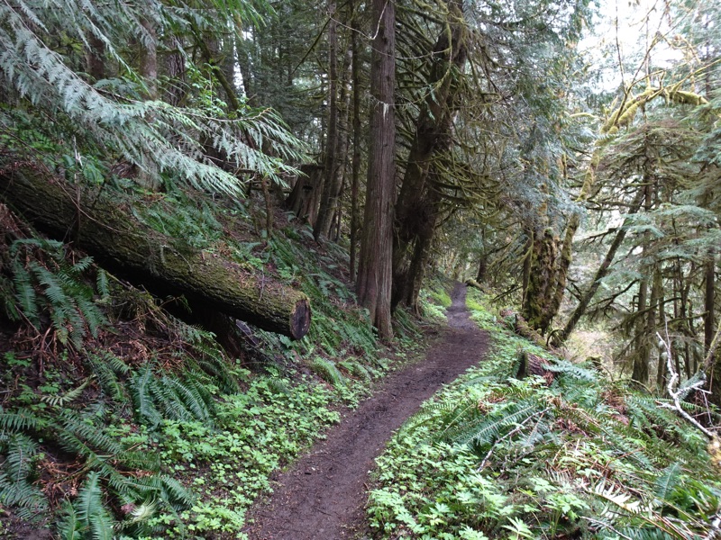 The trail starts with a descent to a bridge over the river, but for a fair way it is just gentle up and down and pretty easy going. There are ferns and salal and, here and there, some rather large trees. The trail follows the river, and eventually runs along it. We even stopped to soak our feet for a bit. The water was icy.