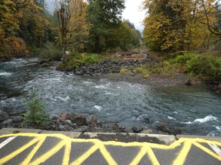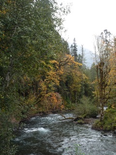 We took a short walk along the Elwha River starting at Madison Falls where the road ends. The mountains were misty and topped with early season snow. The autumn foliage was near its peak. We walked past the mule camp and around the bend for some good views of the river recently nourished by the seasonal rain. We stopped at the gap in the road cut by a hearty new Elwha tributary.