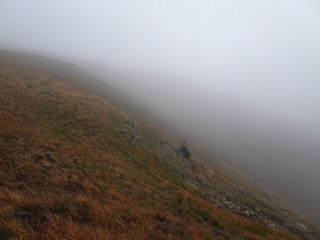 We were up at Hurricane Hill again to check for signs of winter. There were clouds in the mountains and the hills were shrouded with mist. The next post down is just pictures of the fall color and the gray, but here are some photos showing signs of winter.
