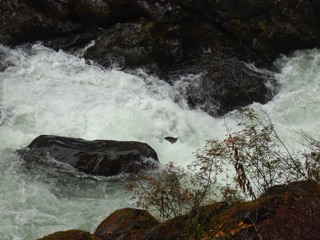 The salmon are making their way up to Sol Duc Falls. We stopped on our way up to the falls to watch them leap at the Salmon Cascades. On our first visit, there were just a few of them, but, on our most recent visit, there were lots of them. They're hard to photograph. It's a matter of shutter luck, but we managed to get a few pictures. We also took the short walk out to the falls ourselves. It was on foot. No leaping up streams for us.