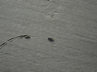 We also saw some little sand worms and their trails of snot and sand along the beach and olive shells with their distinctive tracks. We walked far out on the sand into the sea. The sky was bright and the ocean endless.