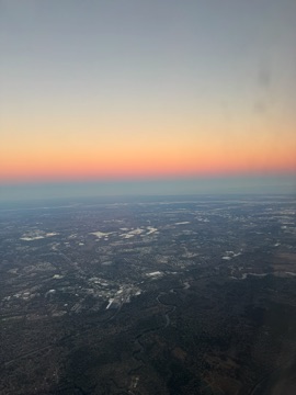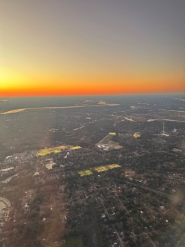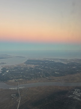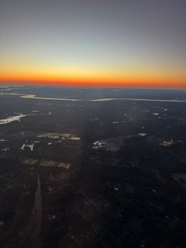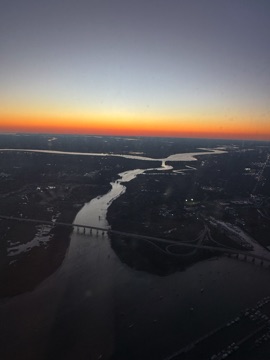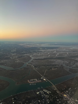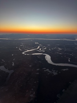There aren't a lot of good flights to the southeast from Seattle. Usually, one has to change planes in Atlanta, but Alaska Air has a lone daily non-stop flight that leaves in the morning and arrives in the evening. This time of year, that meant we caught the sunset. We didn't see any mountains as we approached the city. The land was flat and the rivers meandered.