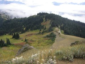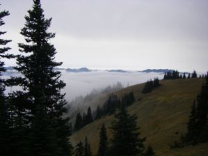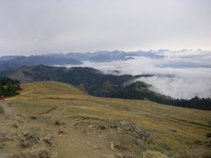 Hurricane Hill was spectacular. The white fog had returned at the start of the trail, so we couldn't see any mountains until we made our way up to The Hamper, noted for all its dirty sock plant. Then, the views began with high, snow topped mountains rising out of a sea of cloud. Clouds pressed in from the Pacific, spilled through valleys, and washed up against mountain sides. Not everything was perfectly visible, but the views were spectacular none the less.