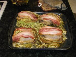Clean the grouses, or grice. Save any good insaginnies. Clean the cabbage and save eight of the largest leaves for wrapping the grouses. Shred the rest of the cabbage using the slicing blade of a food processor. Cut up four rashers of bacon into 1/2" bits. Toss the shredded cabbage and bacon with a teaspoon or two of thyme, marjoram or both, and some salt and pepper. If there were any hearts or crops, chop them up and toss them in as well.