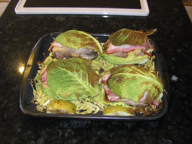Cut up the apple into eight pieces. Put a piece of apple, a chunk of butter and as much of the cabbage mix as you can into each grouse. Put the remaining cabbage mix into a flat roasting pan. Put each grouse, breast side up, on a cabbage leaf. Drape two rashers of bacon over it and cover it with another cabbage leaf.