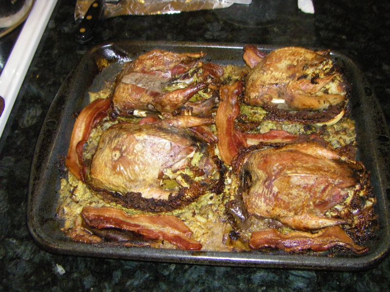 When the birds are basically cooked, remove the upper cabbage leaves. Slide the bacon down to the sides of each bird so it doesn't burn. Raise the oven temperature to 450F and give the grice another 10 or 15 minutes. This should brown the birds nicely. They can be served straight from the oven along with the cabbage.