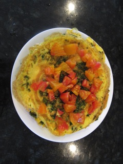 We've been having wonderful weather, and that means the local farmers have been doing really well. The produce at the Port Angeles Farmers' Market has been early and excellent, so we've managed to have our first crespiou of the season in the middle of June. A crespiou is a stack of two egg omelets, each layer with its own combination of flavors, usually centered on some farm fresh vegetable. This year's first crespiou had five layers, each with two eggs and: