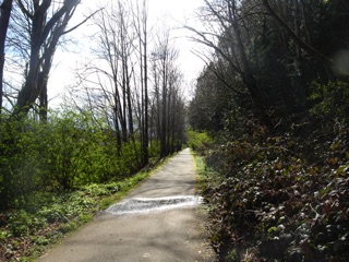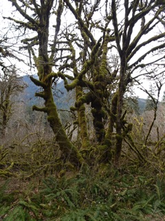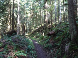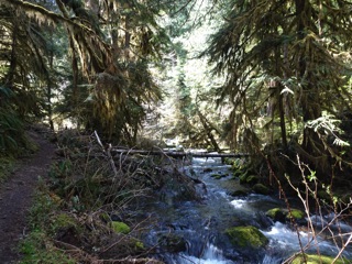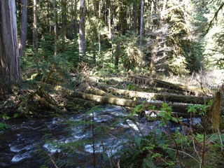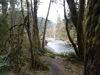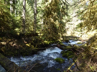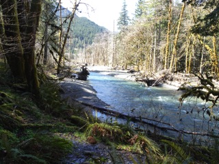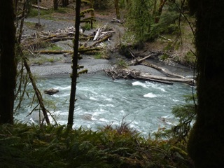 Now that spring is here, we've been hiking from Madison Falls up along the Elwha to the Altair Bridge. Most of the route follows Olympic Hot Springs Road, but the road is cut off by the river not far from the trailhead, so we take the detour through the hills around the old, now flooded, campground.
