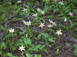 We drove up to Hurricane Ridge and found Hurricane Hill Road closed but with almost all of the snow melted. We boot on our boots, just in case, and headed down the road on foot. There were glacier lilies and avalanche lilies waiting for us. We made it to the overlook at the sharp turn in the road then down past the upper end of the Wolf Creek Trail. Then up towards the picnic areas and finally the Hurricane Hill trailhead. It looked like we could make our way all the way to Hurricane Hill, though when the going got tough, that is where that steep climb starts, we stopped, rested and made our way back.
