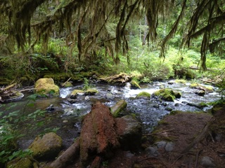 We took a short hike following the Elwha River from the Madison Falls parking lot, up and down the detour and then to Olympic Hot Springs Road. It's summer now, and the spring flowers are gone. The park people have been doing some work on the trail, making it wider at points and shoring it up. Meanwhile, the mules are back in town, and the Elwha River is roaring.