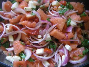 We had this watermelon salad at the breakfast buffet at the Halekulani Hotel in Honolulu. We liked it so much that we had it a few times and reversed engineered it. At first, we thought the little white things were chunks of tofu, but further tasting revealed them to be mozzarella. It was an interesting salad and a real mixture of cultures, so we've adopted it as one of our luau standards. Either that, or make a jack-o-melon.