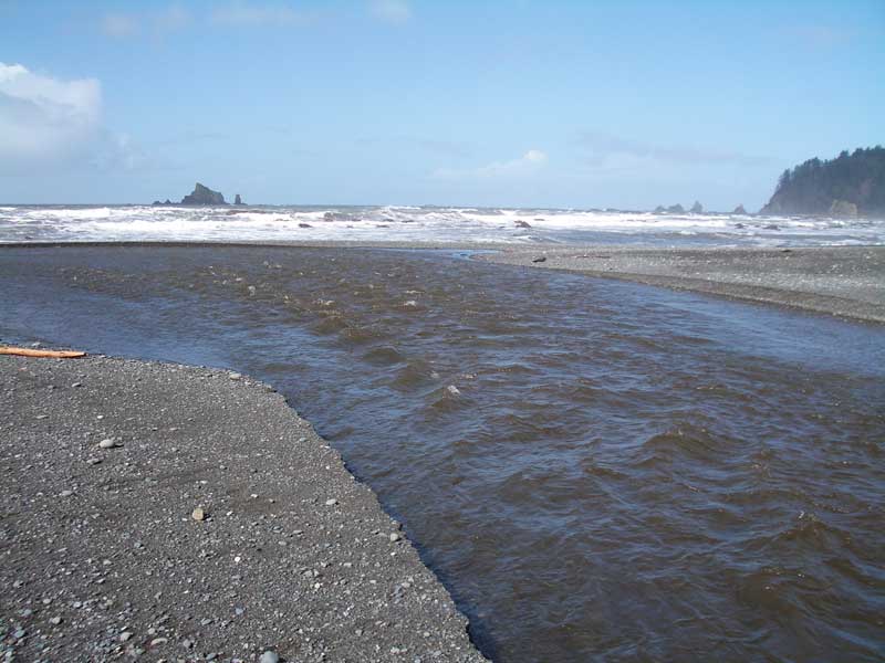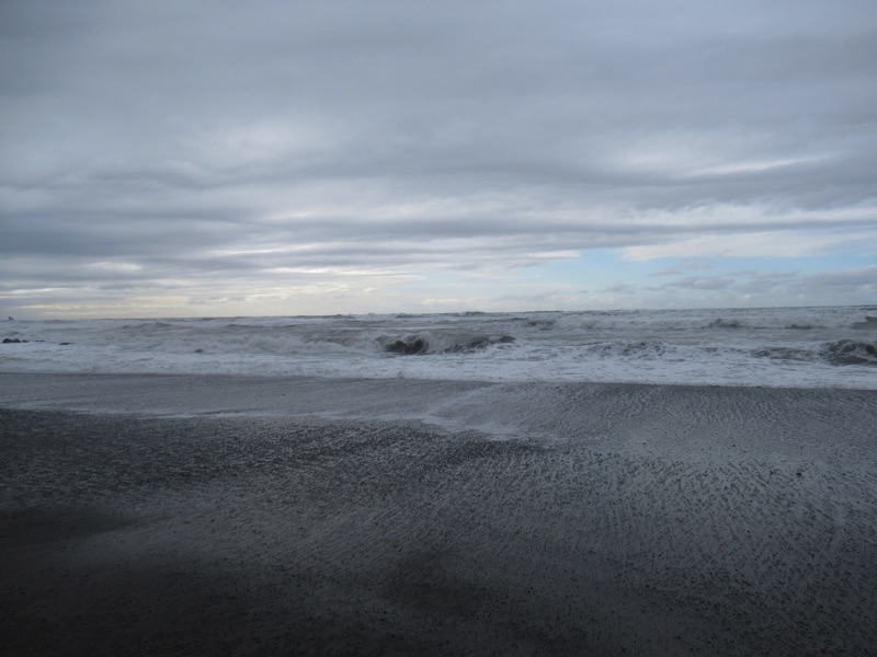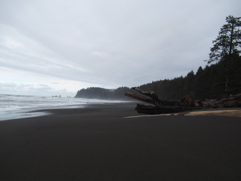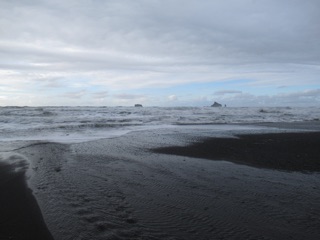 We were out at Rialto Beach the other day, and it shows signs of winter. The sand is dark and gritty, and the tide pools relatively bare. You can see the rough current in the little river about a mile north of the parking lot.