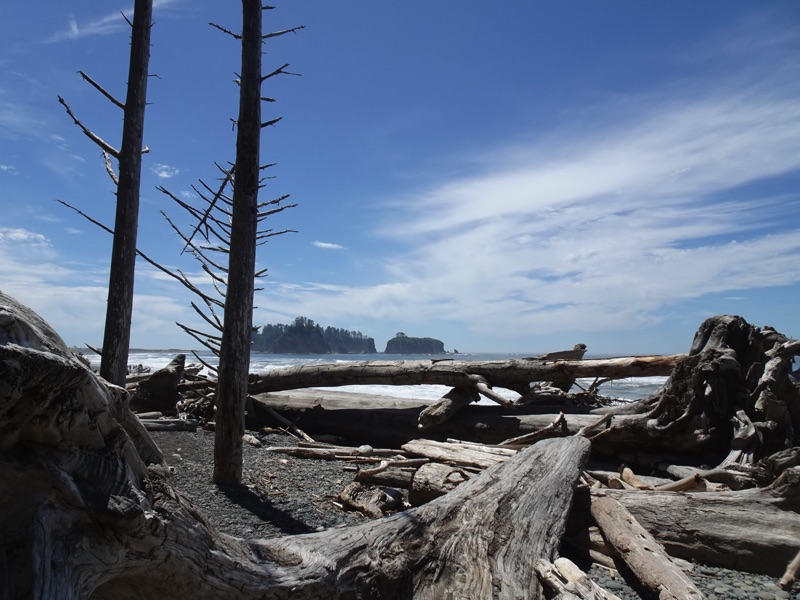 We’ve been having some clear sunny weather, and sometimes it has been a bit warm for hiking inland, so we decided to head out to Rialto Beach where the cold Pacific Ocean keeps things cooler. By the time we arrived any morning fog had vanished. The sky was an intense blue and the waters were calm.