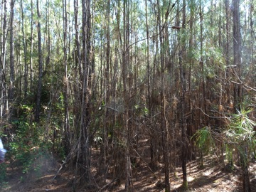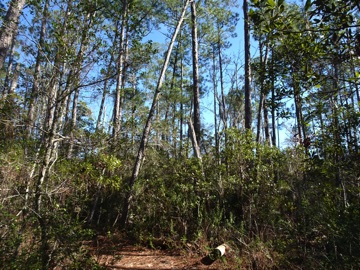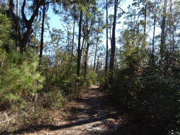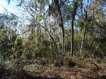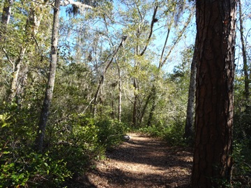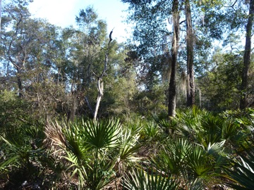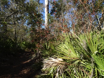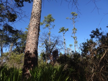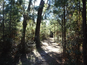 One of our favorite places to wander on Big St. Simons Island is the Guale Preserve. Coming from the Northwest, it's exotic country with its flat terrain, gnarled trees, sandy soil and palmettos. The first part of our walk had a bit of up and down though not enough to qualify as terrain. It was old sand dunes now covered with organic matter, forest and palmetto. We headed back on the old telephone line trail which was completely flat. Welcome to the Southeast.